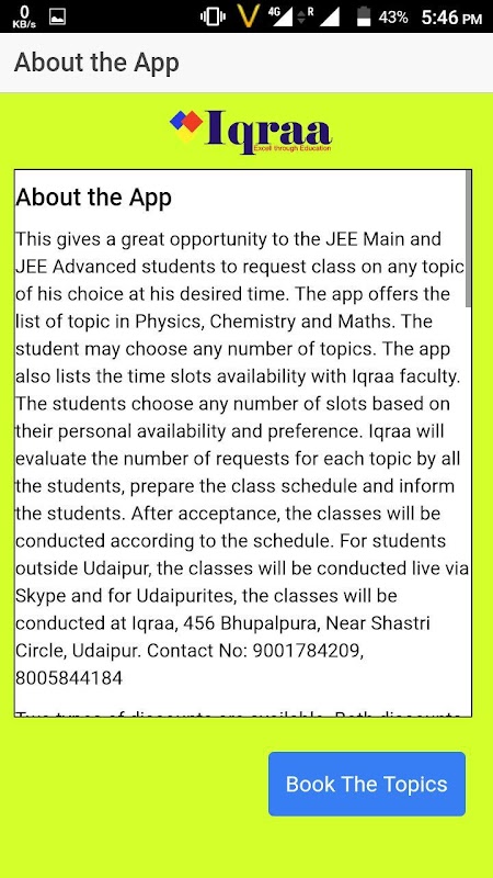 Bu onun istenilen zamanda kendi seçtiği herhangi bir konuda sınıf istemek için JEE Main ve JEE Gelişmiş öğrenciler için büyük bir fırsat verir. Uygulama Fizik, Kimya ve Matematik konuların listesi sunar. Öğrenci konulardan herhangi sayıda seçebilir. App ayrıca Iqraa fakülte zaman dilimlerinde durumu listeler. Öğrencilerin kişisel kullanılabilirlik ve tercihine göre yuvalara herhangi bir sayıda seçin. Iqraa, tüm öğrenciler tarafından her konu için istek sayısını değerlendirmek sınıf programı hazırlamak ve öğrencileri bilgilendirecek. kabul edildikten sonra, sınıflar programa göre yürütülür. Udaipur dışındaki öğrenciler için, sınıflar Skype üzerinden canlı yapılacaktır ve Udaipurites için, sınıflar Iqraa, 456 Bhupalpura, Yakın Shastri Circle, Udaipur de yapılacaktır. İletişim No: 9001784209, 8005844184