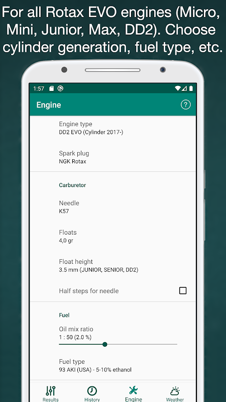 Bu uygulama, sıcaklık, rakım, nem, atmosfer basıncı ve motor konfigürasyonunuzu kullanarak Rotax 125 Max EVO (Micro Max Evo, Mini Max Evo, Junior Max Evo, Senior Max Evo) kartlar için kullanılacak püskürtme ve buji hakkında bir öneri sunar Dellorto VHSB 34 XS karbonhidrat kullanan Max DD2 Evo) motorlar.