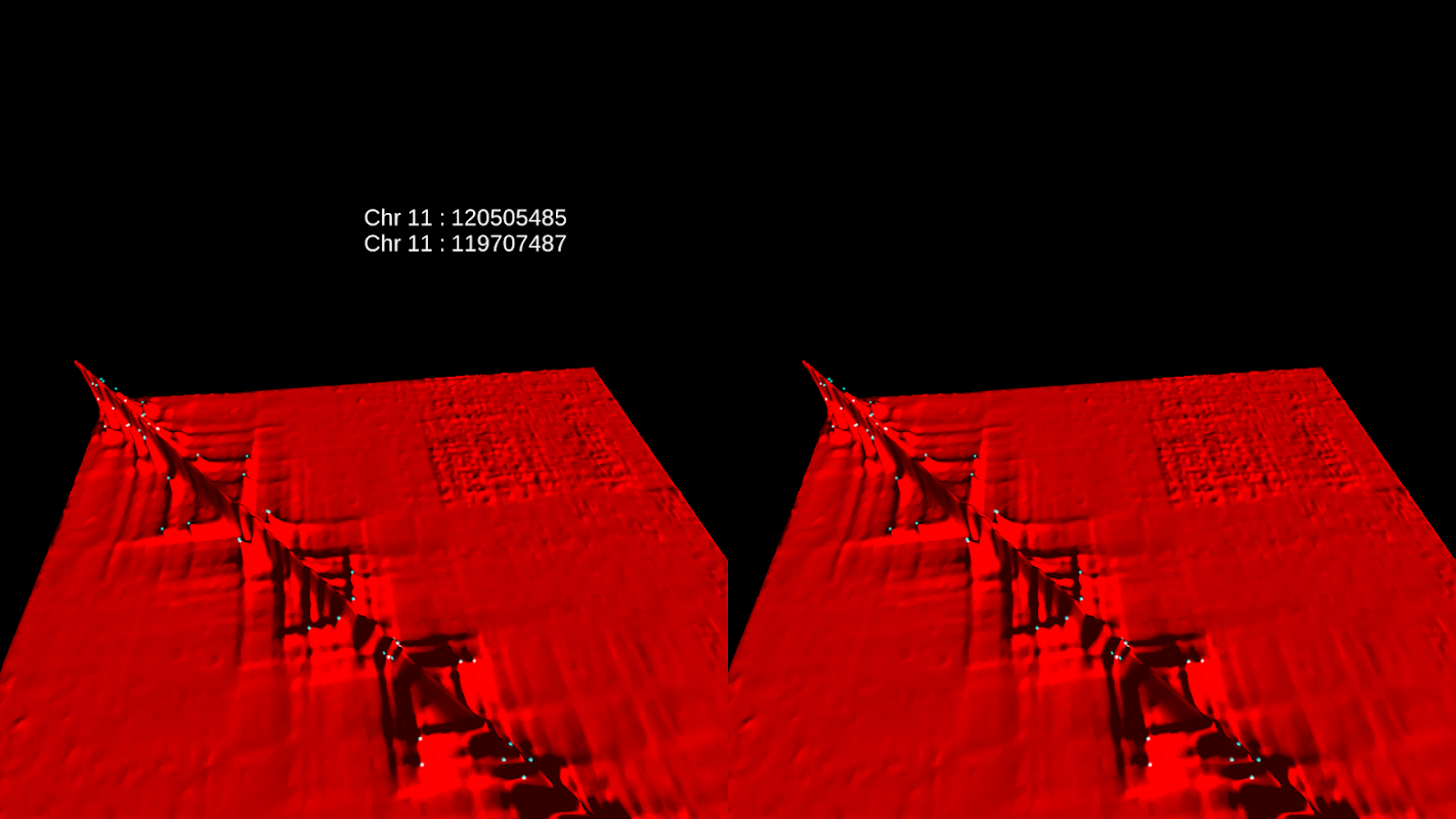 Juicebox VR üç boyutlu genom sekanslama için Hi-C yöntemi ile oluşturulan verilerin bir sanal gerçeklik temsil oluşturur. Manzara her 2D pozisyon üç milyar harf uzunluğunda insan genomunda, 1D pozisyonları, ya loci bir çift gelir. 2B konumunda yüksekliği iki lokus bir hücrenin çekirdeğinde temas ne sıklıkta temsil eder.