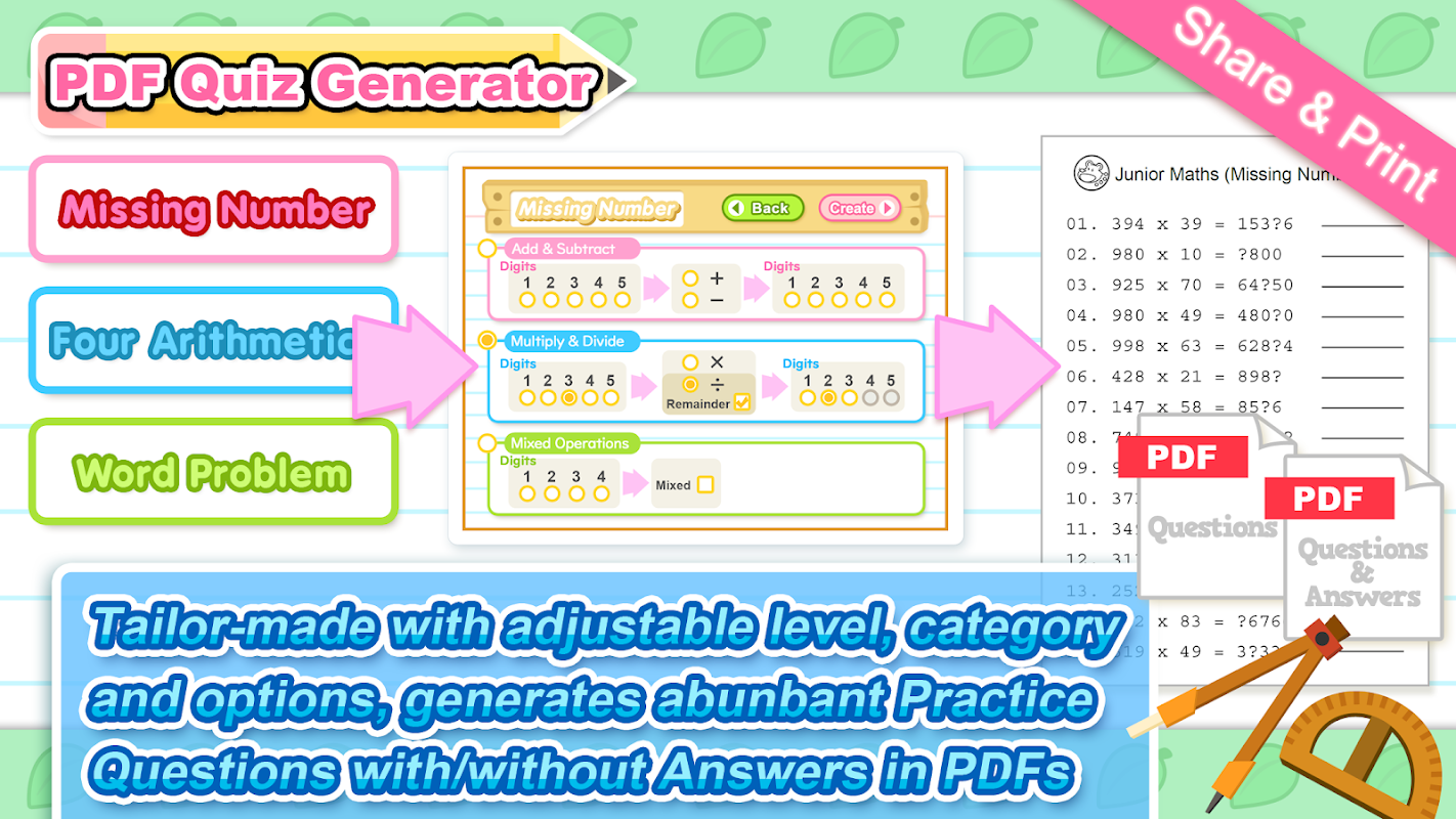 - PDF egzersiz ve cevap kağıtlarının 3 tip üretilen ve ayarlanabilir düzeyi, kategori ve seçenekleri ile kişiye özel yapılabilir.