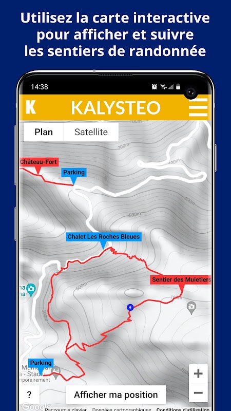 - une carte interactive permettant d'afficher en temps réel votre position GPS, afin de repérer les points d'intérêt situés autour de vous et suivre les traces GPS de plus de 50 randonnées.