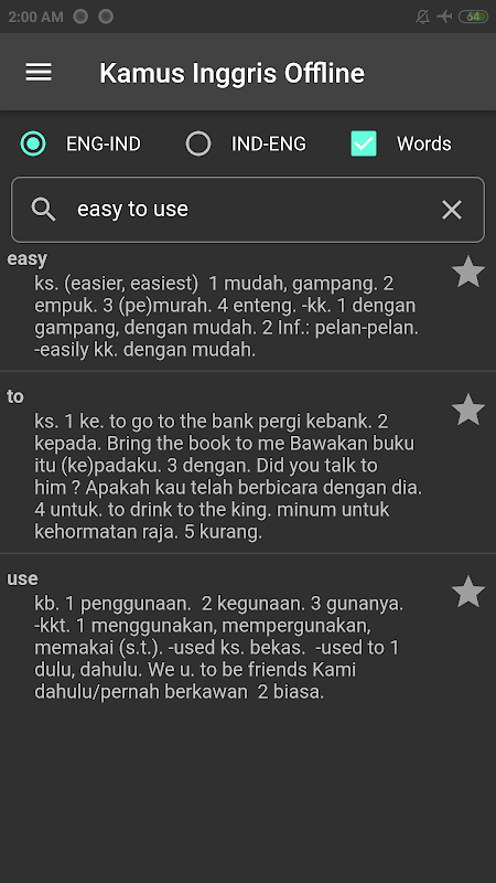 Sözlük İngilizce - Endonezya ve Endonezya - İngilizce% 100 çevrimdışı veya internet bağlantısı olmadan kullanılabilir, kullanımı kolay ve yani birkaç özellikleri ile birlikte geliyor: