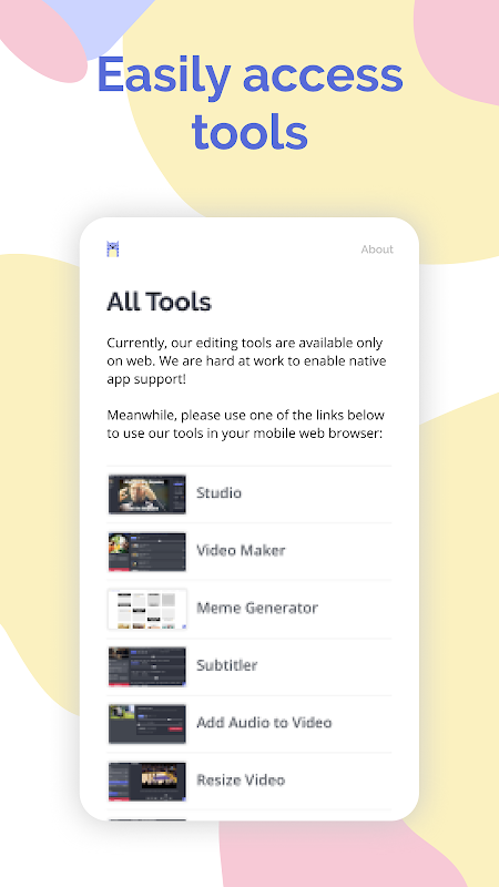 The Kapwing Android app serves as a launchpad into our tools on the browser. In the future, we hope to add more native functionality to the app to allow our users to edit directly in the app without having to visit the browser.