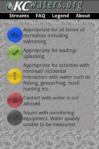 KCWaterBug is an application developed by KCWaters.org, which provides hourly updates of water quality at numerous streams throughout the Kansas City metropolitan area. The application provides a color coded alert based on an estimate of the amount of bacteria that may be found in a particular stream using known relationships between bacteria concentrations and basic water quality parameters.