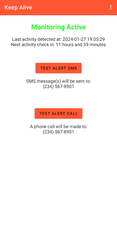 Keep Alive, etkinliği algılamak için cihazınızın kilit ekranını veya başka uygulamaları kullanır. Cihazınız belirli bir süre boyunca kilitlenmemiş veya kilidi açılmamışsa ya da seçilen uygulamalara erişmediyseniz 'Orada mısınız?' sorulacaktır. bildiri. Bu bildirimin onaylanmaması durumunda bir Uyarı tetiklenecektir. Yapılandırılmış Acil Durum İletişim Ayarlarına göre, yardıma ihtiyacınız olabileceğini başkalarına bildirmek için bir veya daha fazla SMS mesajı ve/veya telefon görüşmesi yapılacaktır.