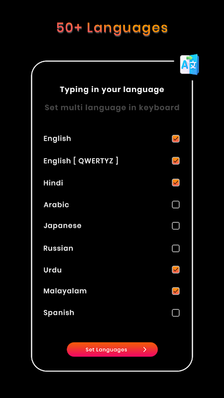 • Our Keyboard which has been support over 50 languages (English, Hindi, Arabic, Bulgarian, French, German, Greek, Japanese, Korean, Malay, Russian, Urdu, Spanish or etc).