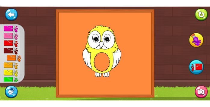Uygulama, hayvanlar, meyveler, sebzeler ve çok daha fazlası dahil olmak üzere her biri kendi benzersiz temasına sahip çeşitli boyama sayfalarına sahiptir. Boyama sayfaları, koyu ana hatlar ve renkle doldurulacak geniş boşluklar ile basit ve renklendirmesi kolay olacak şekilde tasarlanmıştır. Çocuklar, kullanmak için bir dizi renk arasından seçim yapabilir ve tatlı ses özelliğiyle sadece bir dokunuşla renkler arasında geçiş yapabilir.