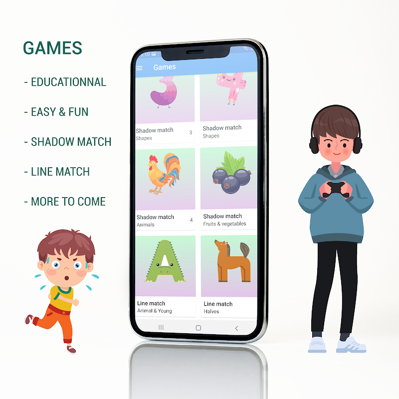 * Shadow Match: let's you match different forms (geometric, fruits, vegetables, animals) to their shadow, get points and compete with yourself by improving your best time.