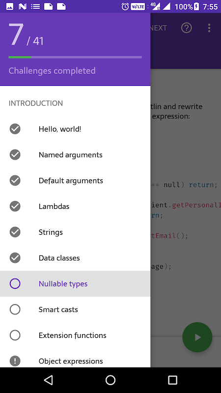 Kotlin Kōans allows you to learn Kotlin programming in bite-sized 5-minute sessions. As an Android developer, you may have a busy schedule and not get enough time to learn an entirely new language on the side. If you're in that situation, Kotlin Kōans is here to help - just solve 1 or 2 challenges whenever you get a few minutes, and within a few weeks you'll have a good understanding of Kotlin fundamentals.
