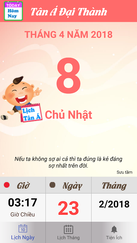 Ứng dụng Lịch Vạn Niên Tân Á 2019 xem lịch ngày và tháng nhanh chóng và vô cùng chính xác. Cho phép bạn xem lịch âm cũng như lịch dương và thông báo các ngày đặc biệt trong tháng trong năm. Ngoài ra nó còn là một công cụ mạnh mẽ chuyển đổi ngày âm sang dương và ngược lại. Đồng thời nó còn hiển thị các danh ngôn tục ngữ hay làm cho bản thân bạn có thêm sức sống và động lực làm việc, tình yêu, cuộc sống ...... Ứng dụng lịch điện tử vạn niên này hoàn toàn có thể thay thế được lịch truyền thống dán tường. Và hơn bao giờ hết bạn không cần phải thay lịch hàng năm như lịch truyền thống. Ứng dụng sẽ tự cập nhật lịch hàng năm hàng tháng chính xác một cách tuyệt đối. Lịch âm dương vạn sự như ý.