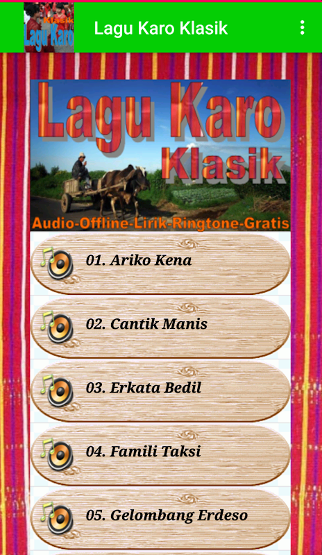 Meyveler. Sunulan Android uygulaması "Klasik Karo Şarkılar". Efsanevi karo şarkıları - Bu uygulama şimdiye kadarki en iyi klasik karo şarkıları bir koleksiyon içerir. Şarkıların çoğu en iyi besteci Tanah Karo, Djaga Depari'nin eseridir. Lütfen Erkata Bedil, Koro Bean, Piso Surit, Taneh Karo Simalem gibi efsanevi Karo şarkılarının tadını çıkarın.