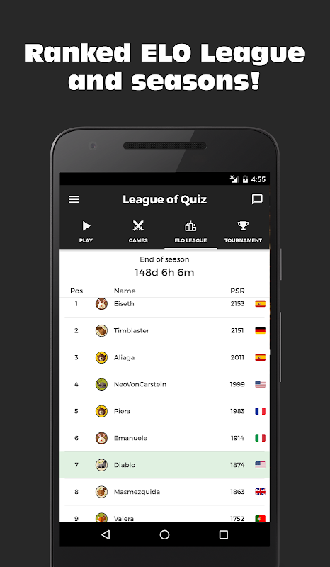 League of Quiz, birden fazla oyun modu ve turnuvası olan ücretsiz bir bilgi yarışması oyunudur. Arkadaşlarınıza masa oyunlarıyla trivial pursuit oyunlarında veya ELO Ligi'nde yarışarak düellolarda meydan okuyun. Ayrıca, dostça oyunlar veya sıralamalı tek oyunculu modda oynayabilirsiniz.