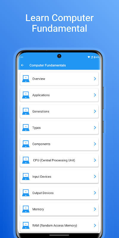 📖 Derinlemesine Öğrenme Modülleri: Uygulamamız temel konuları kapsamakta ve bilgisayarla ilgili temel bilgilerin çok yönlü anlaşılmasını sağlamaktadır: