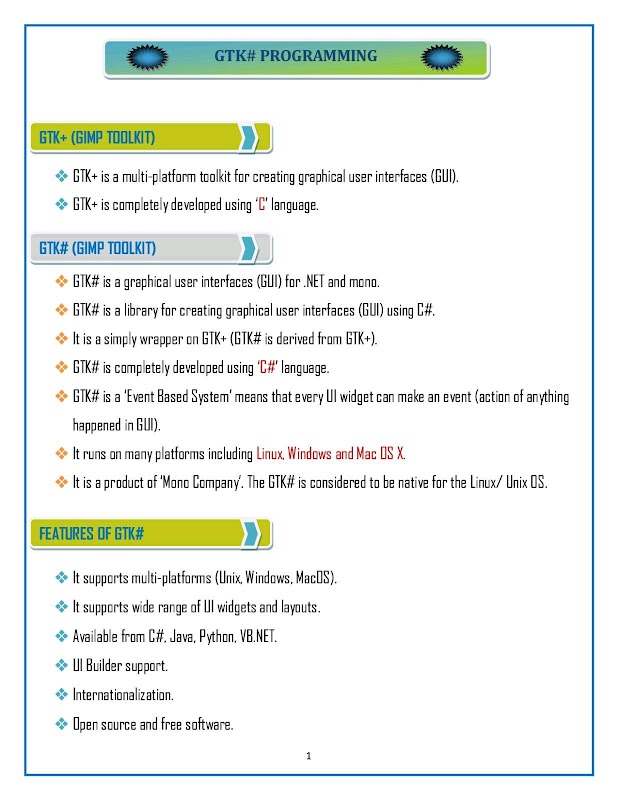 For any application, we feel it's good when it 'Looks' good. Here is a tutorial on GTK# Programming that lets you create interactive "Graphical User Interface" for your application and make it look splendid with the ease of use of commands. GTK is a cross platform widget toolkit for creating UI. This tutorial facilitates a step by step procedure to learn and fabricate dynamic 'user friendly' applications. When there could me so many non-promising sources in the web for GTK# learning this tutorial stands unique and uncompetable due to its detailed elaboration and covers every aspect of GTK# programming. With GTK you could create your own desktop environments like Unity, or windows managers like Consortium, word processors like Abiword, IDE, web browsers, personal information managers and much more exciting, attractive, elegant applications which makes our work faster and enhances the appearance.