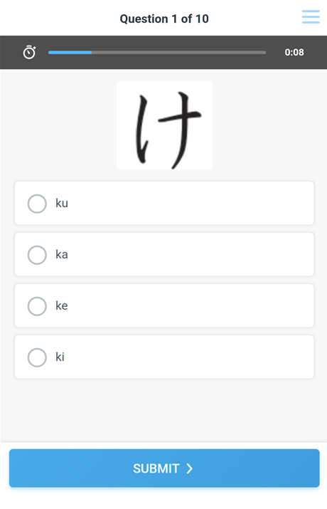 Learn japanese hiragana and katakana in a few hours without effort by simple quiz.