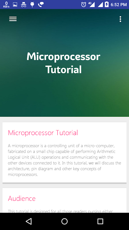 This application allows users to learn microprocessor and all the topics related to it in a step by step hierarchy manner.