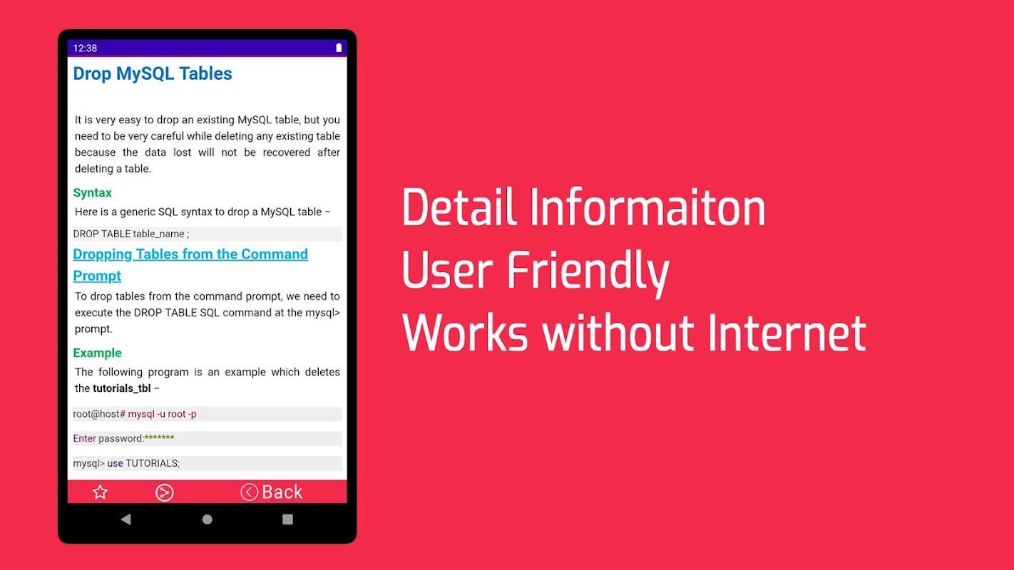 Learn MySQL offline tutorial app is essential for programming students and engineers. This MySQL database app will give you example and explanation. This app will provide you most common & useful chapters. So now you can carry your MySQL book collection anywhere by this app and can learn anytime.