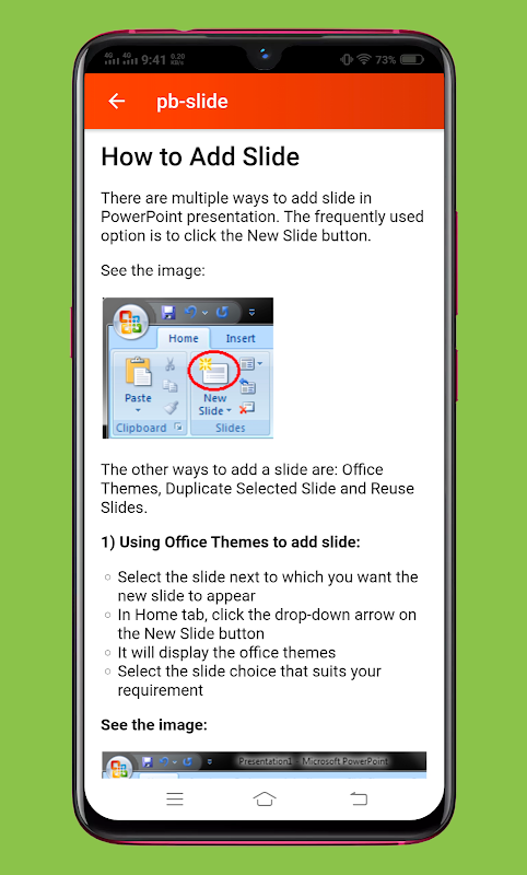 Learn MS PowerPoint, MS PowerPoint Tutorials.This app covers basic to advance concepts of MS PowerPoint. Learn MS PowerPoint app will help you increase your knowledge about MS PowerPoint. Using this app you will be able to learn how to use MS PowerPoint application in computer. This app includes information about how to use different tabs in MS PowerPoint. This app will definitely help you to increase your knowledge of MS PowerPoint.