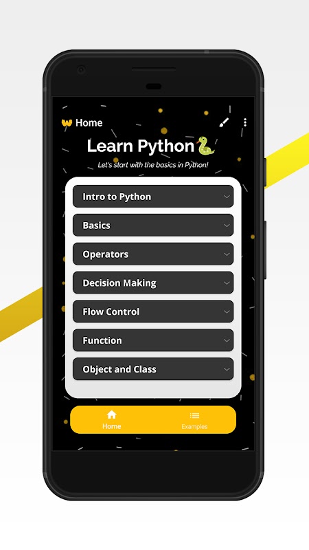 Bu uygulama Python'un tüm önemli kısımlarını kapsar. Python programlamanın temelleri ile ilgili olarak çeşitli konuların düşünülmesini geliştirmek için yaratılmıştır. İlgili konular ve bunların sözdizimi, kaynak kodundan oluşur.