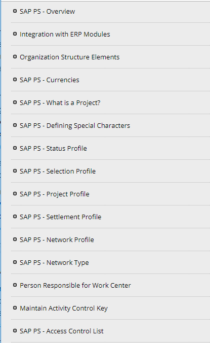 SAP PS, Tutorial, Learning, Overview, Integration with ERP Modules, Organization Structure and Elements, Currencies, What is a Project?, Defining Special Characters, Status Profile, Selection Profile, Project Profile, Settlement Profile, Network Profile, Network Type, Person Responsible for Work Center, Maintain Activity Control Key, Access Control List, Cost Component, Execution Service Profile, Budget Management, Number Ranges for Budgeting, Revenues and Earnings, Dates, WBS Scheduling Parameters, Material, Versions, Project Information System, Consultant Responsibilities.