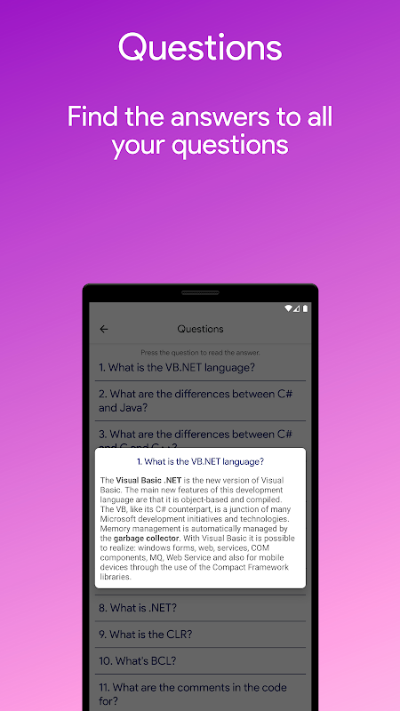 Uygulama çok basit bir arayüze sahiptir ve herkes tarafından kullanılabilir. Öğrenme VB.NET çevrimdışı ve herhangi bir zamanda ve yerde kullanılabilir. Özellikle VB.NET'i öğrenmek isteyenler için değil, derinleştirmek veya gözden geçirmek isteyenler için de önerilir.