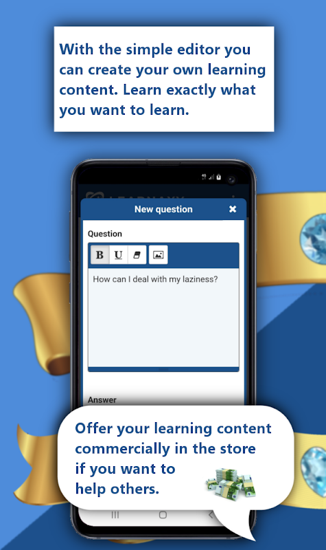 With the editor you can create your own learning content. Learn exactly what you want to learn and need for your life. You can offer your own learning content commercially in the store and help others.