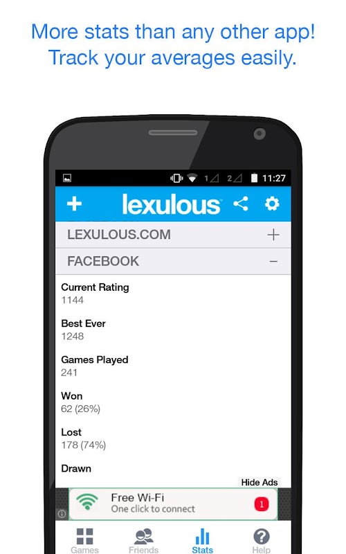 Küresel Sıralama ile ortalama istatistiklerin anında yüklenmesi. Ortalama puan, oynanan Bingo kelimelerinin toplam puanı ve daha fazlası gibi istatistiklerinizin ayrıntılı bir resmini alın.