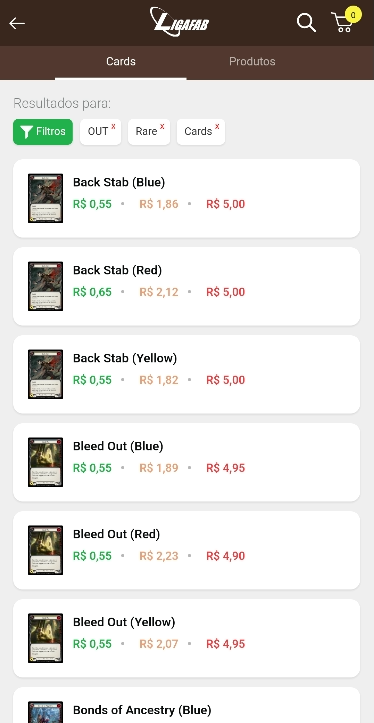 LigaFAB Uygulamasında kartların fiyat artış ve düşüşlerine sahip olacak ve aynı anda birçok mağazadan satın alacaksınız. Ayrıca, satın alma işleminizin başarılı olmasını sağlamak için LigaSegura aracılığıyla ödeme güvenliğine sahip olacaksınız.