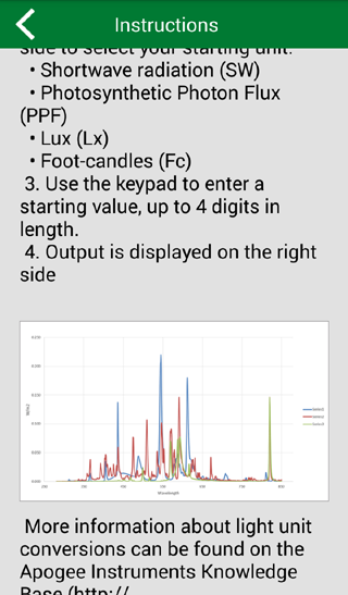 Apogee Instruments Işık Unit Converter uygulaması T5 Sylvania floresan ışıkları, metal halide, yüksek basınçlı sodyum ve güneş ışığı dahil olmak üzere çeşitli ışık kaynakları için farklı ışık birimleri arasındaki dönüşümleri hesaplar. Birimler kısa dalga radyasyon (GB), fotosentez foton akı (PPF, PPFD), Lux (lx) ve Ayak-mum (fc, lm / ft2, veya ft-c) içerir.