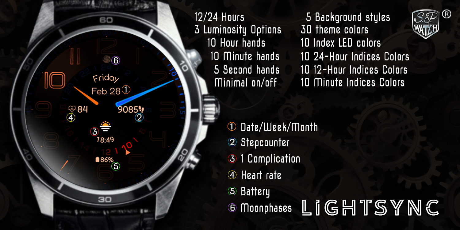 Bu minimalist saat kadranı benzersiz, enerji dostu bir tasarıma sahiptir ve özelleştirilebilir. 30 tema renk kombinasyonunun yanı sıra 10 akrep, 10 yelkovan, 5 saniye ibresi, 10 24 Saatlik indeks rengi, 10 12-Saatlik indeks rengi, 10 dakika indeksi rengi, 5 Arka plan stili, 1 özelleştirilebilir komplikasyon, 3 parlaklık içerir. seçenekler ve 2 minimalist seçenek. Kullanıcılara akıllı saatlerinin görünümünü kişisel zevklerine uyacak şekilde kişiselleştirme esnekliği sağlamak üzere tasarlandı.