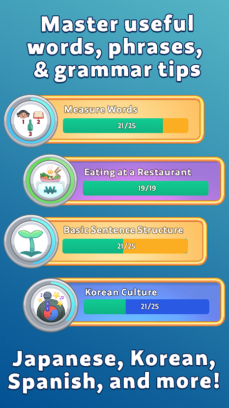 - Yemek Siparişi Vermek ve Yeni İnsanlarla Tanışmak gibi temalarla günlük yaşamla ilgili kelimeleri ve cümleleri öğrenin.
