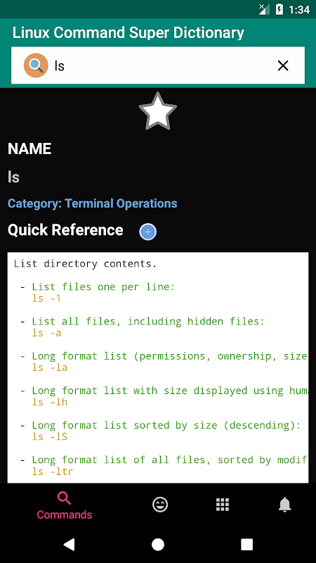 Bu uygulama aynı zamanda komutları farklı kategorilerde sınıflandırır (İnternet ve Ağ, Terminal Operasyonları, Servis ve Süreç, Kullanıcı İzni, vb.). Böylece operasyon ihtiyacınıza göre yeni komutları kolayca öğrenebilirsiniz.