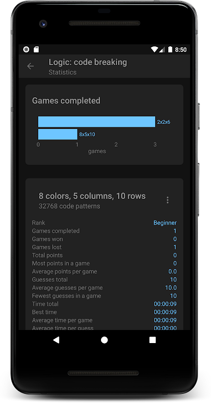 Bitirdiğiniz her oyun için istatistikleri görebilir, böylece kendinizle yarışabilir veya arkadaşlarınızla karşılaştırabilir ve zamanla Logic: kod kırma becerilerinizi geliştirebilirsiniz.