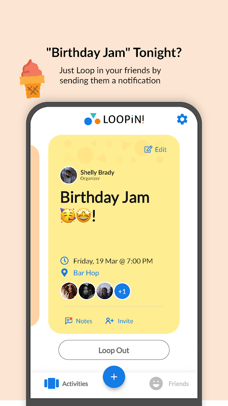 Kısa sürede bir plan hazırlamak için LOOPiN'i kullanın. Bir düğmeye birkaç dokunuşla bir etkinlik oluşturun ve arkadaşlarınıza, döngüye girip başkalarını davet etmeleri için bir bildirim gönderin. Bu kadar basit!