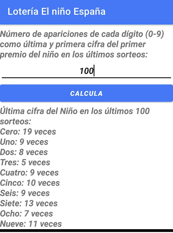 Por último, la aplicación ofrece las estadísticas de las dos últimas cifras del primer premio del Niño. Es decir, las veces que cada terminación (de dos cifras) ha aparecido en el primer premio del sorteo así como los años en los que ha aparecido.