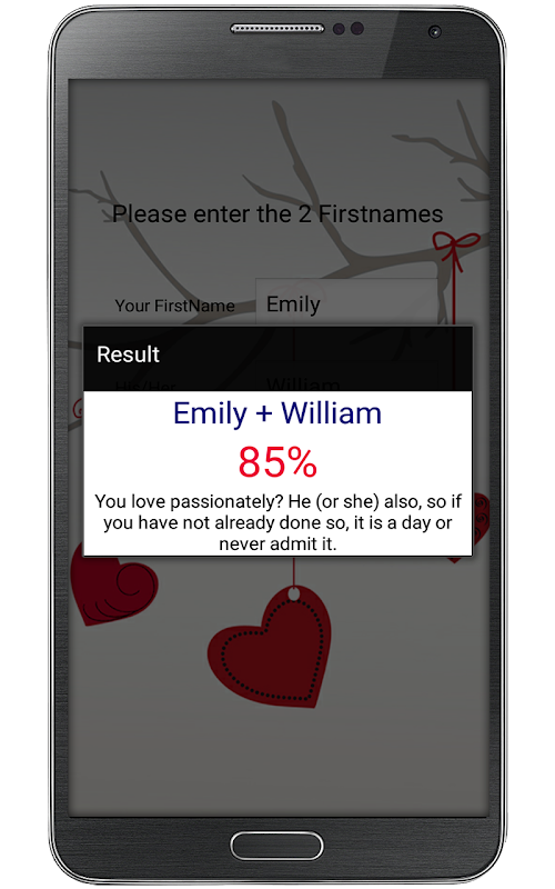 The love test calculator is only for pranks/fun and entertainment purposes. This is just a app; use results from nmae match-making app for prank purposes only. It is not capable of effectively determining the power of love between you and your sweetheart. Do not take the results too seriously.