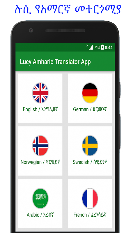 ሉሲ የአማርኛ መተርጎሚያ ምርጥ አፕ! አማርኛ ን ወደ አረብኛ፣ ኢንግሊዝኛ፣ ፈረንሳይኛ፣ ጀርመንኛ፣ ኖርወይኛ፣ ስዊዲንኛ፣ ደችኛ - ሆላንድ ወይም ኔዘርላንድ፣ ስዊድንኛ፣ ጣሊያንኛ ይተረጉምሎታል.