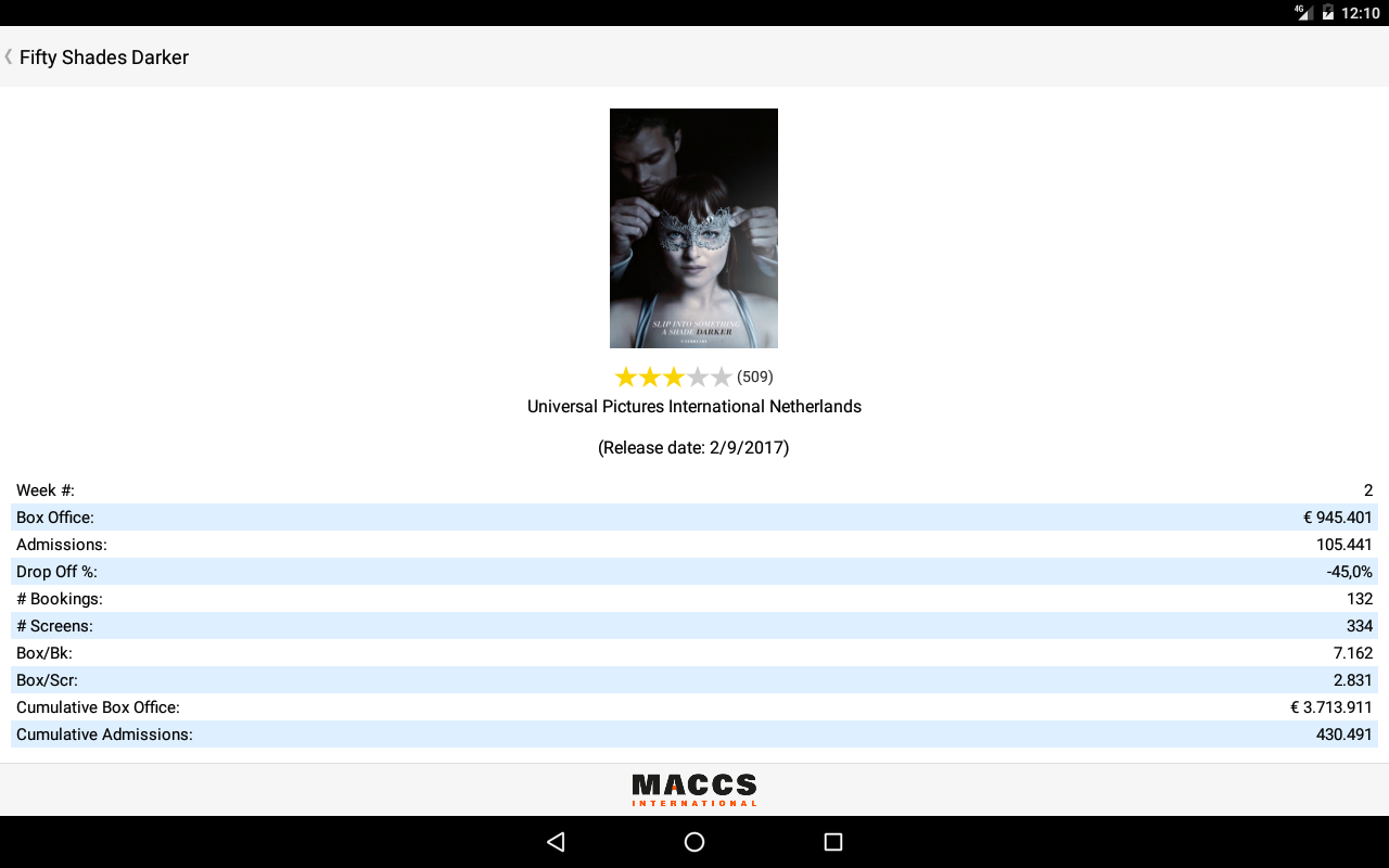 From your mobile device, keep up with the latest movie trends and key performance indicators such as box-office revenue, admissions, weekly drop off %, number of bookings and many more industry standard metrics. In addition, enjoy the official promotional materials such as film poster and trailer(s) (where applicable).