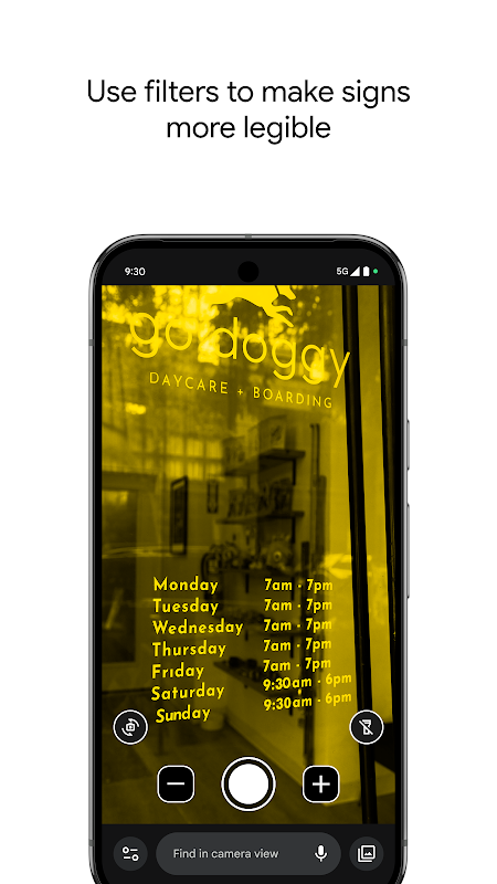 Kameranızı kullanarak küçük metinleri büyütebilir, nesne ayrıntılarını görebilir veya sokak tabelaları ya da sipariş tezgahının arkasında bulunan restoran menüleri gibi uzaktaki metinleri yakınlaştırabilirsiniz. Menüler, hareket saati panoları veya metin içeren herhangi bir yerde ihtiyacınız olanı bulmak için resim çekmeden önce veya sonra kelime arayın. Görsel efekt uygulayarak düşük kontrastlı metnin görünürlüğünü artırın. Işığın az olduğu ortamlarda parlaklık otomatik olarak ayarlanır. Ayrıca, fotoğraf çekebilir ve istediğiniz kadar yakınlaştırabilirsiniz.