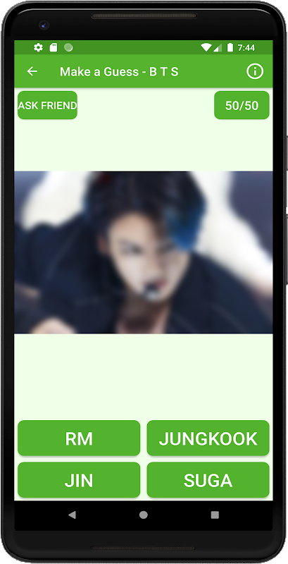 "Bir Tahmin Yap - K-POP" uygulaması, stresten kurtulmanın ve boş zaman geçirmenin eğlenceli ve ilgi çekici bir yoludur! Uygulama, hangi üyenin üzerinde olduğunu tahmin edebilmeniz için yüksek kaliteli bulanık resimler ve görüntüler içerir. Ayrıca 3 farklı zorluk seviyesi bulunmaktadır. Kim olduğunu tahmin edemiyor musun? Merak etme! Uygulama aynı zamanda seçim çok zorsa "Arkadaşa sor" ve "50/50" işlevlerine de sahiptir. V, J-Hope, RM, Jin, Jimin, Jungkook, Suga gibi favori B T'S üyelerini tahmin etmenin keyfini keşfedin ve onların büyük bir hayranı olup olmadığınızı kontrol edin!