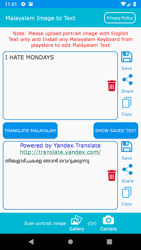 Users can upload the image from Gallery or Camera and get text from it (Malayalam