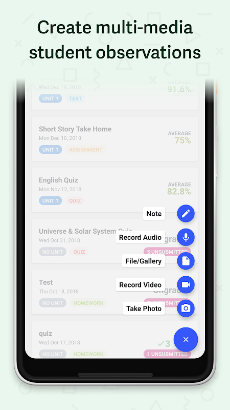 Markboard ile hareket halindeyken öğrenenleri yakalayın. Öğrencinin e-portföyüne fotoğraf, video, ses kaydı ve not ekleyin. Markboard ayrıca, notları doğrudan uygulamanın içinden görüntülemenizi ve düzenlemenizi sağlar.
