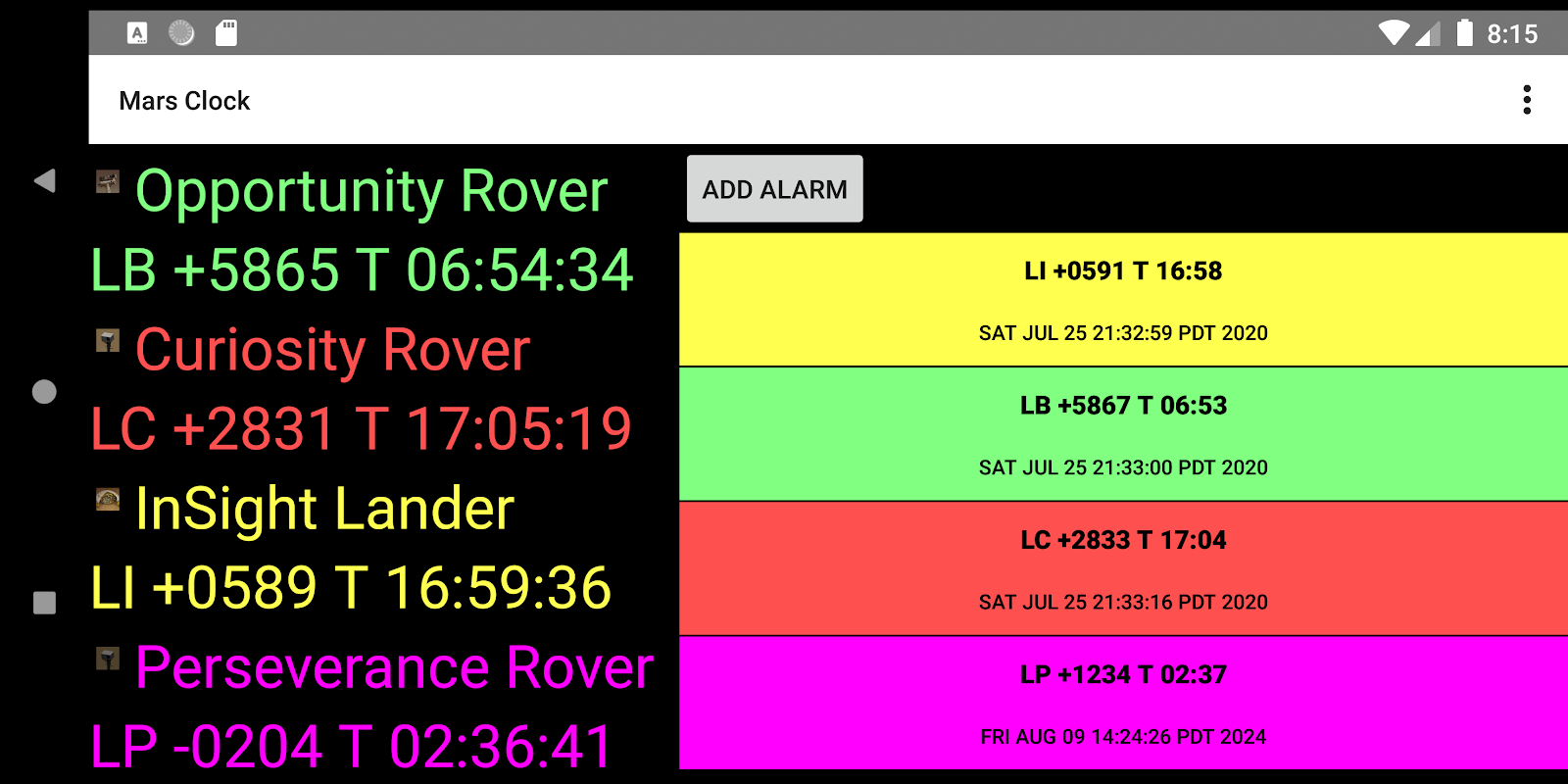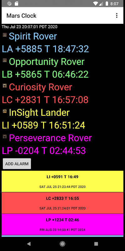 MarsClock, NASA'nın üç Mars gezgini - Ruh, Fırsat ve Merak - ve InSight lander ve yeni Azim gezgini için zamanları görmenizi sağlayan bir çalar saattir. Mars zamanında alarmları, tek atış alarmları veya her solu tekrarlayacak alarmlar (yani her Mars günü) olarak ayarlayabilirsiniz.