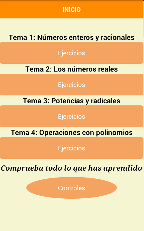 En esta app podrás practicar haciendo ejercicios de números enteros y racionales, números reales, potencias y radicales y operaciones con polinomios, además de un examen para poder comprobar todo lo aprendido. Corresponde a ejercicios del primer trimestre.