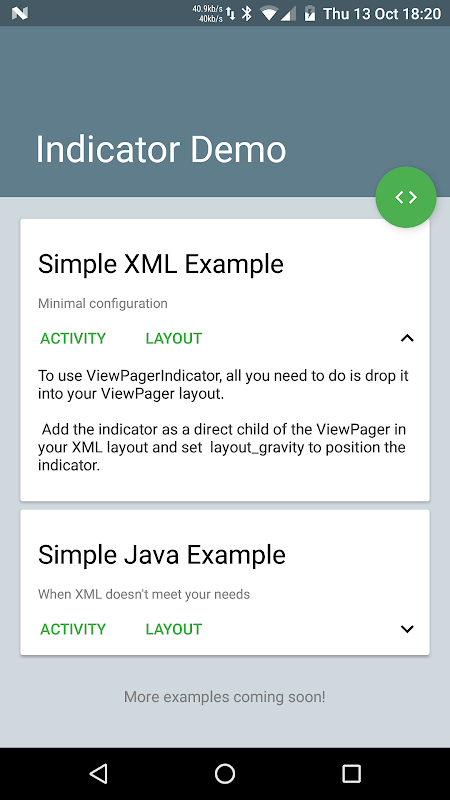Material ViewPagerIndicator is an easy-to-use, drop-in indicator for the ViewPager widget from Android's Support-v4 Library. This app demonstrates its usage with examples and links to appropriate source code.
