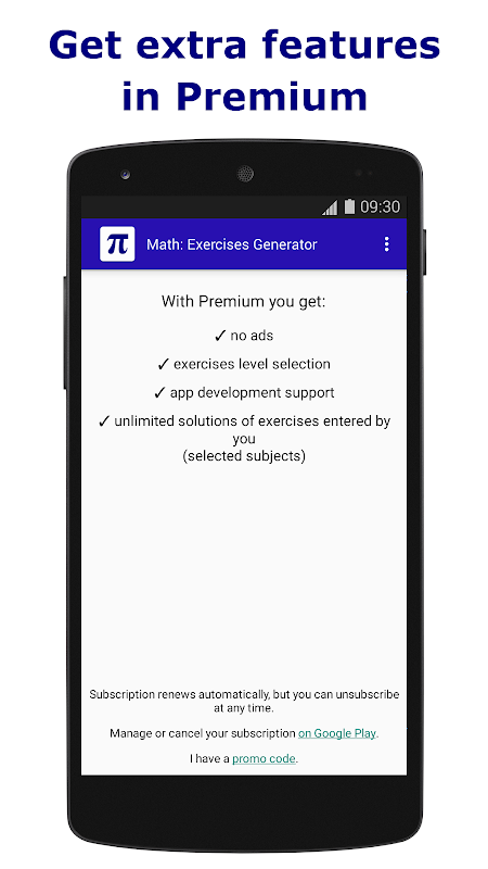 Egzersiz seviyesini seçmek, reklamları devre dışı bırakmak ve uygulamanın sınırsız sayıda egzersizinizi (seçilen konular) çözmesine izin vermek için Premium'u etkinleştirin.