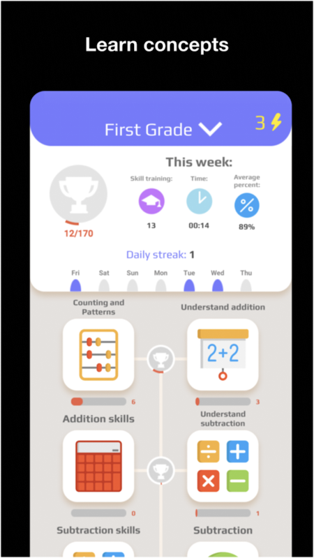 It allows to improve 1th grade math skills easily and quickly. Also you can find math skills aligned with CCSS.