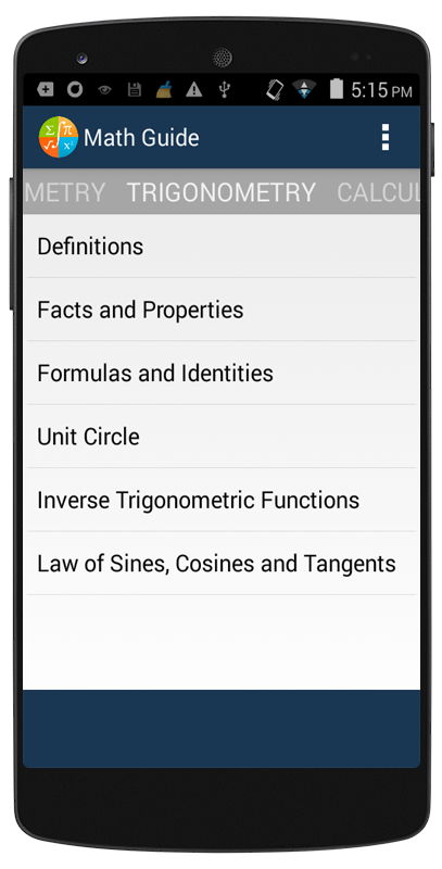 You can keep all mathematical formulas in your packet as Ofline Math Guide. It's very convenient for all students in high school or university and engineers to look for any easy or complicated formulas. It includes: Geometry, Algebra, Trigonometry, Equations, Analytic, Differentiation, Integration, Matrix, Probability and Statistics Units Conversion etc.