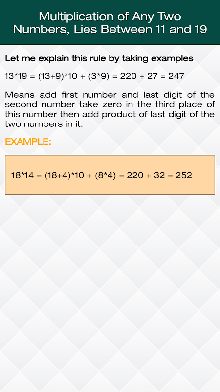 These tricks and formulas will help solve part of the maths problems and tasks much faster than classical. So that these new skills user can use in the store, at school, at college, at work - wherever thanks to quick calculation skills can save a lot of precious time.