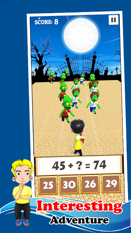 Matematik zombi oyunları, eğitici öğrenme veya beyin jimnastiği uygulaması olabilir. Renkli çalışma sayfalarıyla toplama, çıkarma, çarpma ve bölme işlemlerinin temel ve basit matematik uygulamaları. Her çalışma sayfası seti, tamamlandıktan sonra bir puan gösterir.